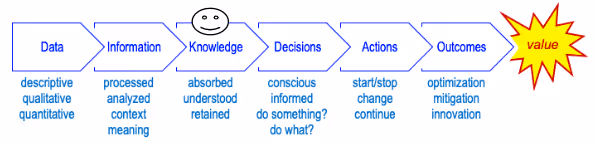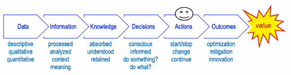Como podemos ver acima, o propósito dessa esteira de transformações de dados é criar um valor para o negócio. É o sonho, o pote de ouro no final do arco-íris. Pode ser algo como reduzir custos ou riscos, manter clientes, aumentar a satisfação com serviços ou produtos, conseguir novos clientes, aumentar a receita, reduzir o rodízio de profissionais e assim por diante.